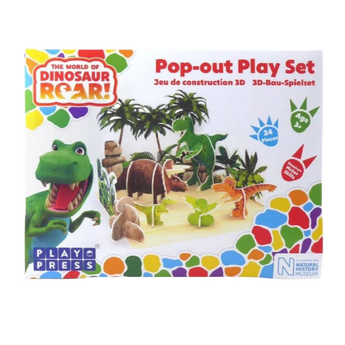 Unleash your imagination with the Dinosaur Roar Playset! Crafted from sturdy Playpress board, this set features Roar, Stomp, Boo, and Squeak from The World of Dinosaur Roar. The packaging doubles as a prehistoric landscape for endless adventures with these playful characters. (Let your inner child run wild!)